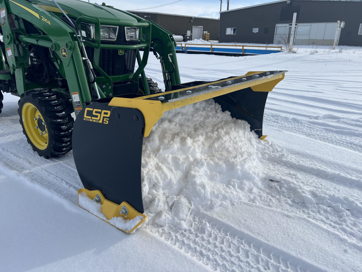 If you work in snow removal or need to clear snow from your jobsite or property, our compact snow pusher attachment is an essential tool. Unlike a typical bucket attachment that requires you to stop and dump a load of snow after each pass, our snow pusher’s purpose-built design allows you to move large amounts of snow more effectively. The 3/8” by 6″ cutting edge allows you to slice through hard-packed snow and ice with ease. This edge bolts onto the unit to ensure a secure fit. The optional Rubber Cut Edge allows a less aggressive edge to protect hard surfaces such as pavement or concrete. Adjustable ½” wear skids enable you to raise the cutting edge as the terrain changes and you require additional height.